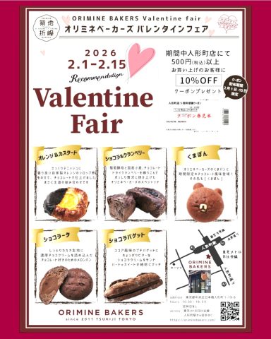 2026.2.1. 日 バレンタインフェア2026 バレンタインフェア2026 人気のチョコレートパンを今年は期間中・毎日ご用意してお待ちしています。 人形店は今年で5周年を迎えます。感謝の気持ちを込めてお買い上げのお客様にクーポン発券!